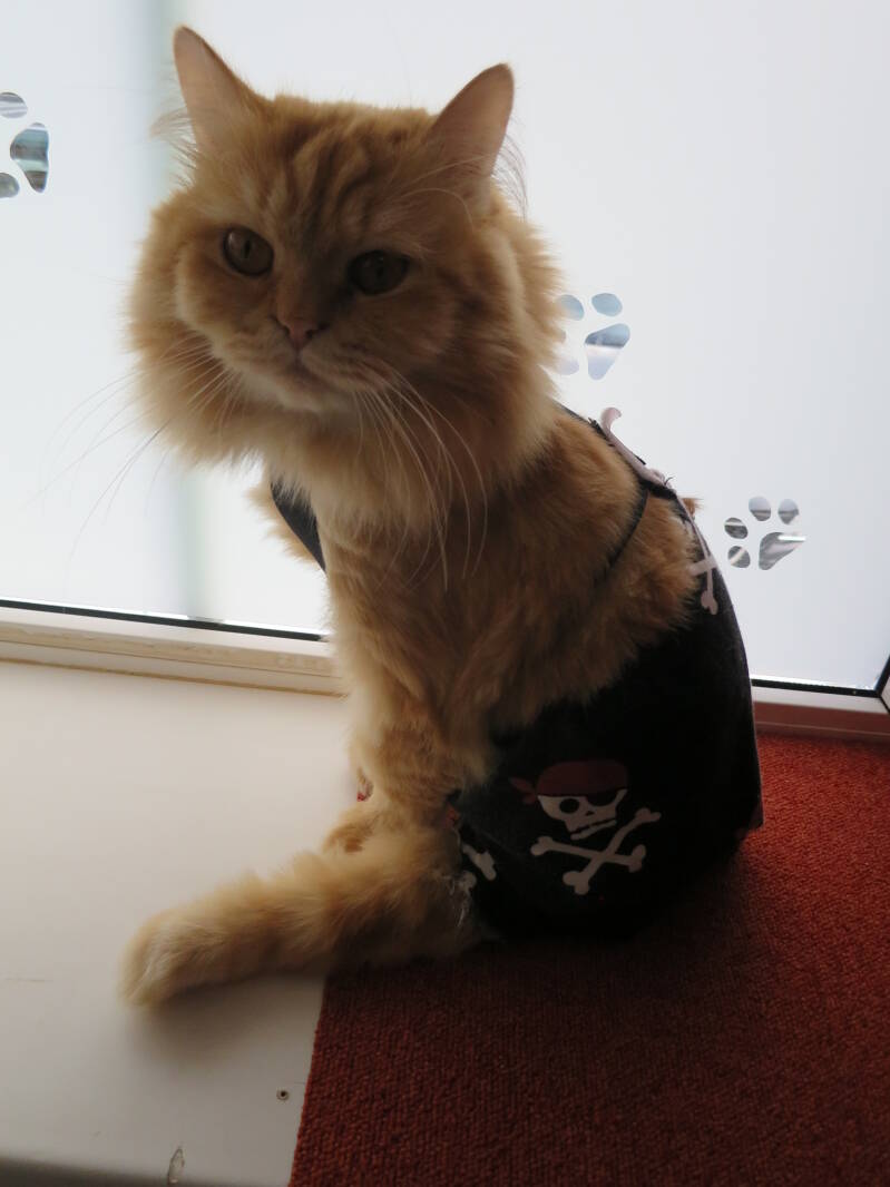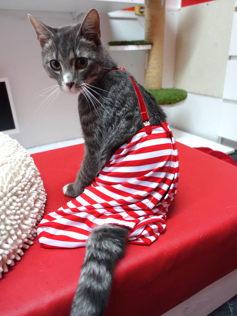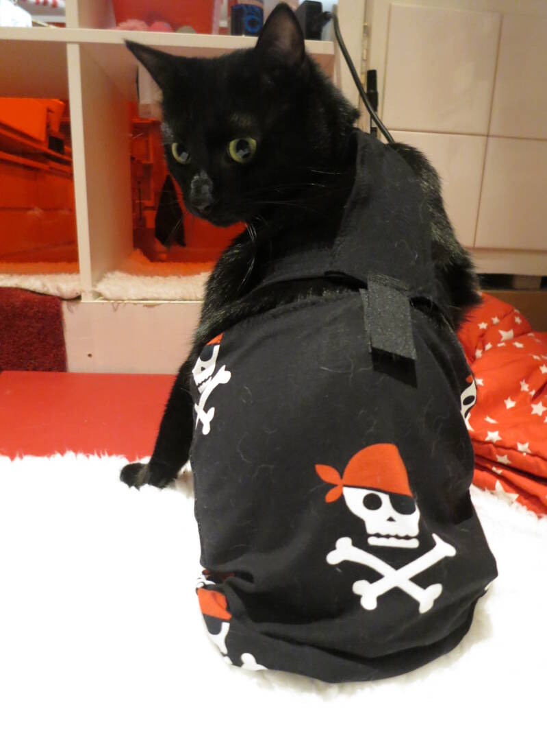 Een andere optie zijn de zogenaamde medical pet shirts of post-op pet shirts. Mijn voorkeur gaat dan uit naar ontwerpjes die je over de rug open kunt maken zodat je het krappe shirtje niet over het hoofd hoeft aan te trekken. Om eerlijk te zijn gebruik ik ze nooit omdat ze nooit aan mijn eisen voldoen. ;)